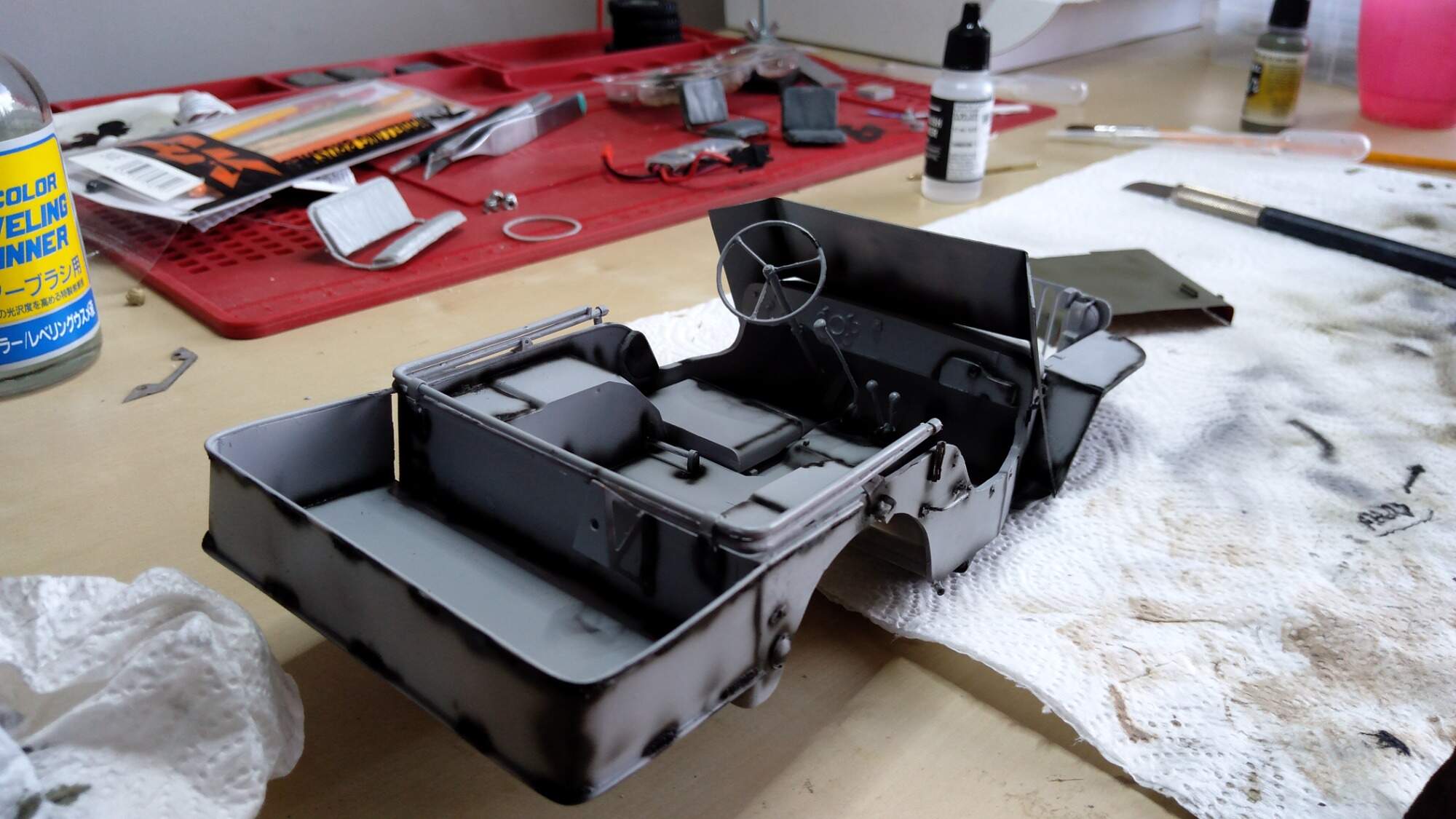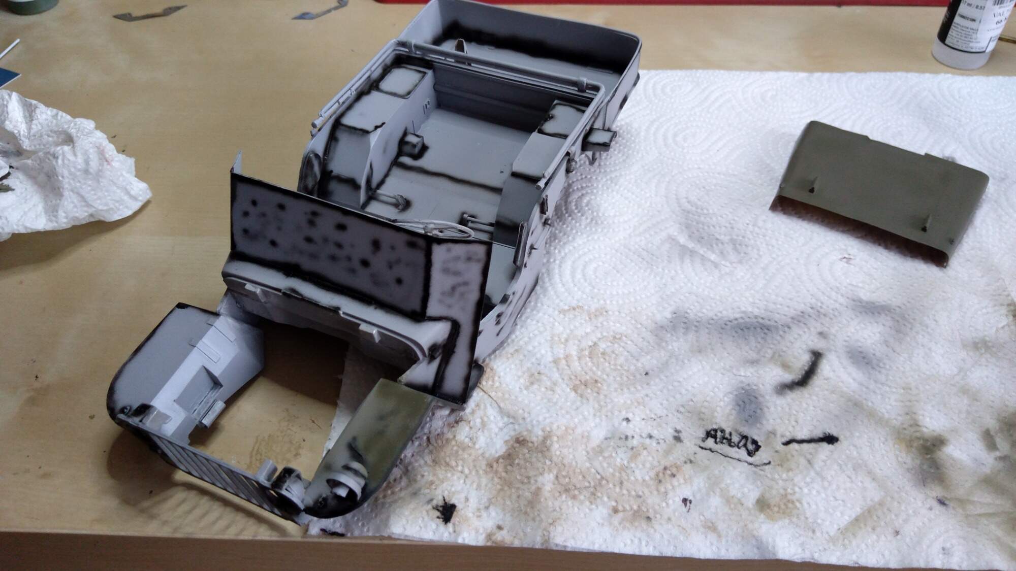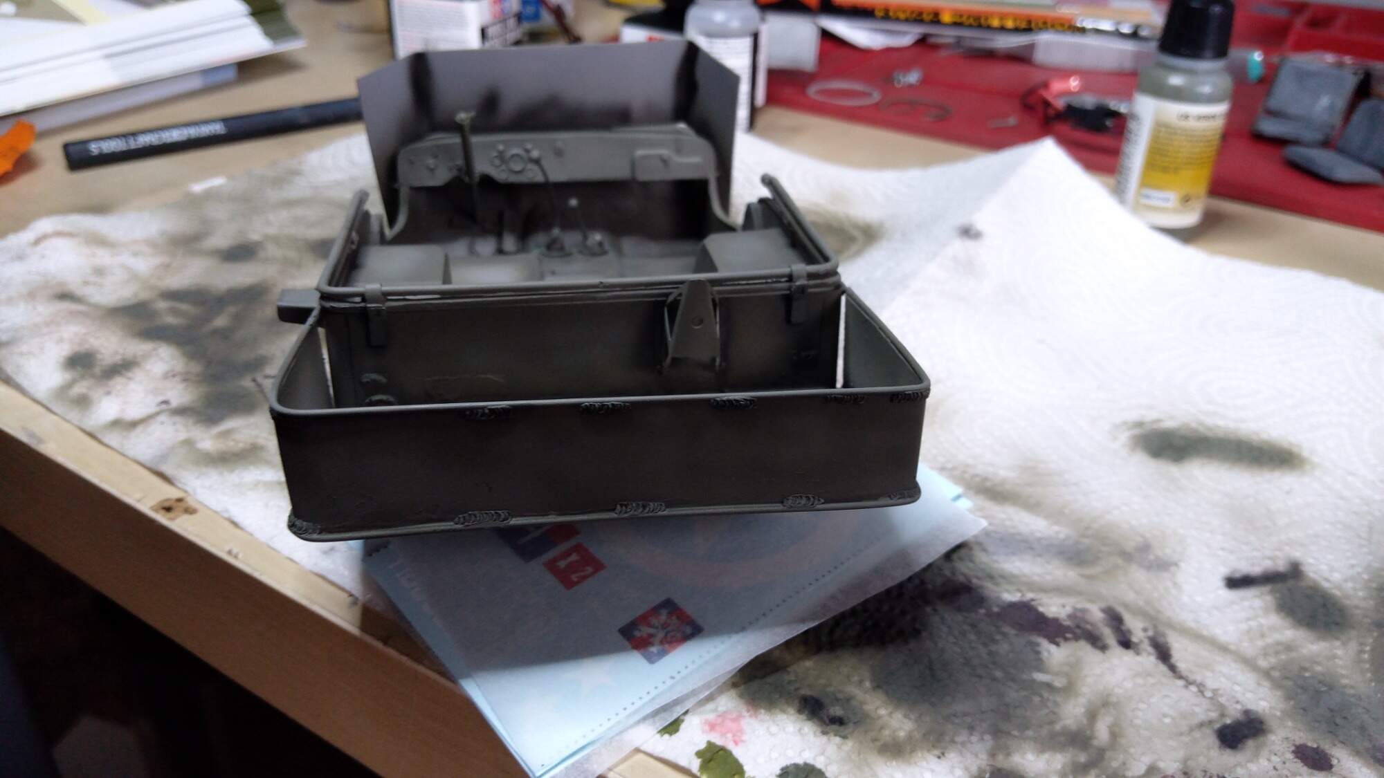Nemám stříkací pistoli a kompresor, dobrou zkušenost jsem udělal se spreji od Tamyia. Jsou dražší, ale zatím se mi nic neloupe a drží i barva na barvě. Vím, že toto řešení je nouzovka, ale každý nemá hned celé vybavení.