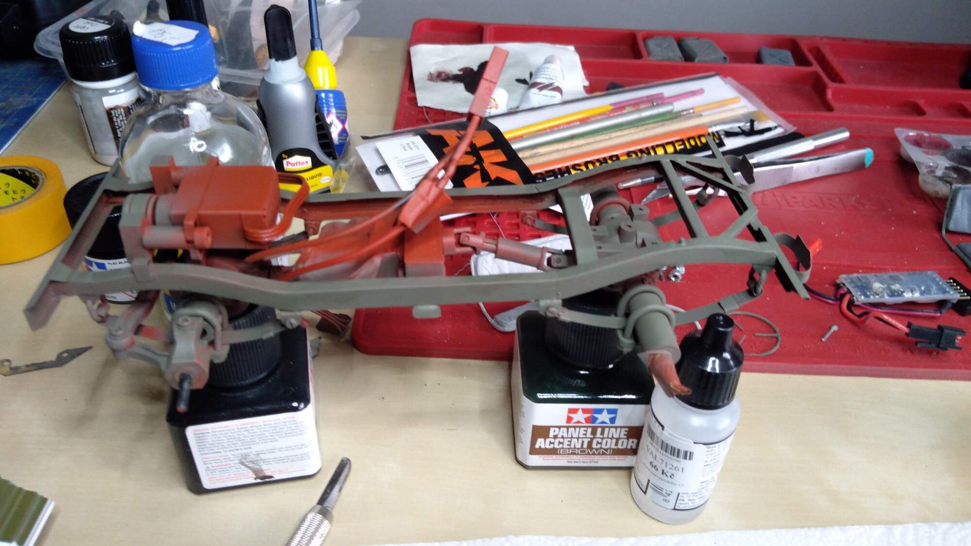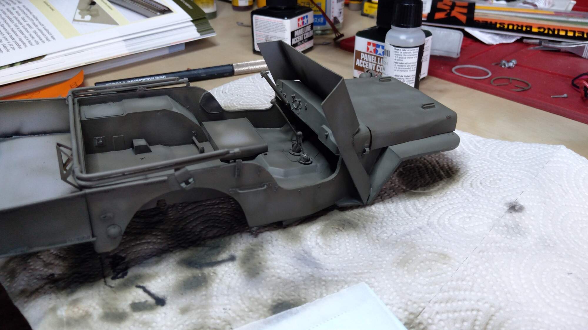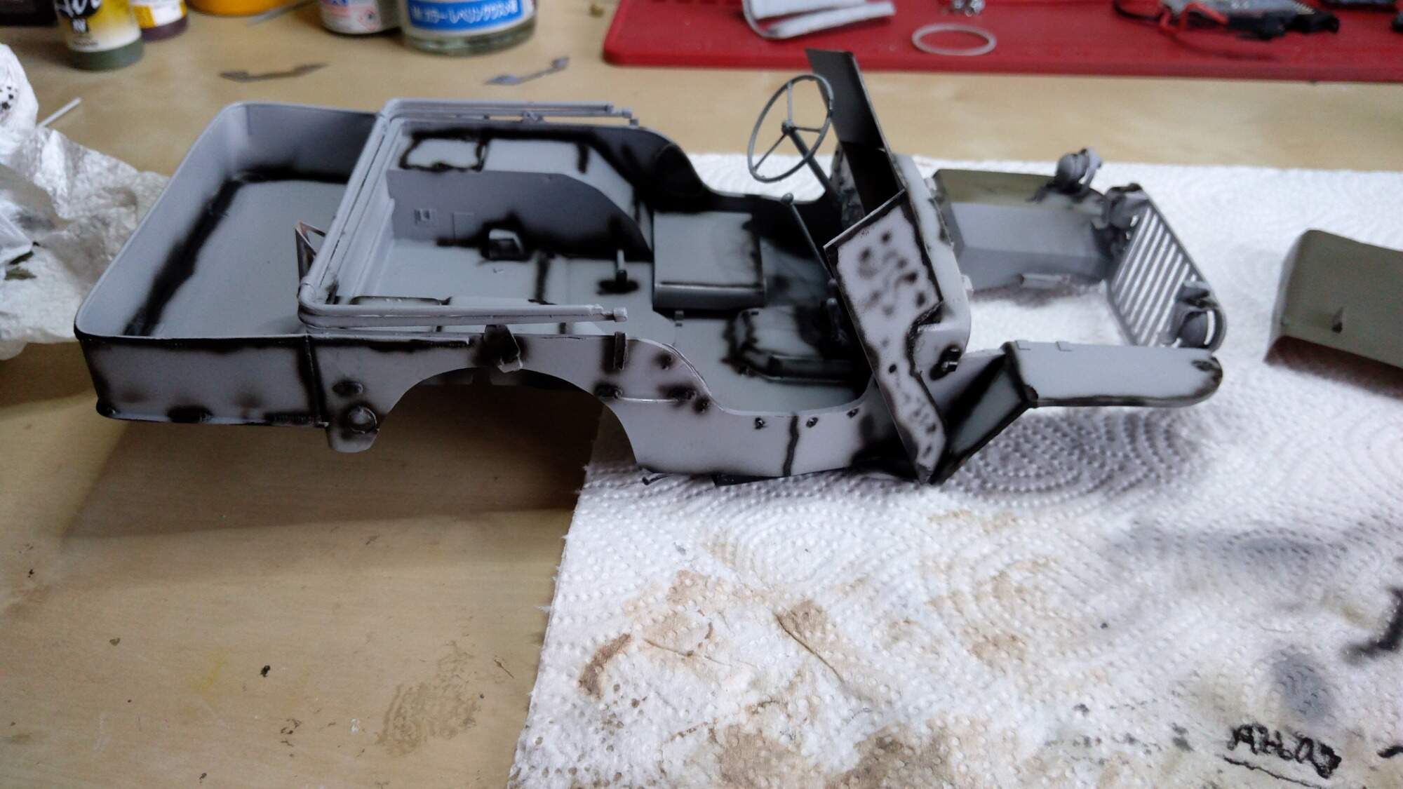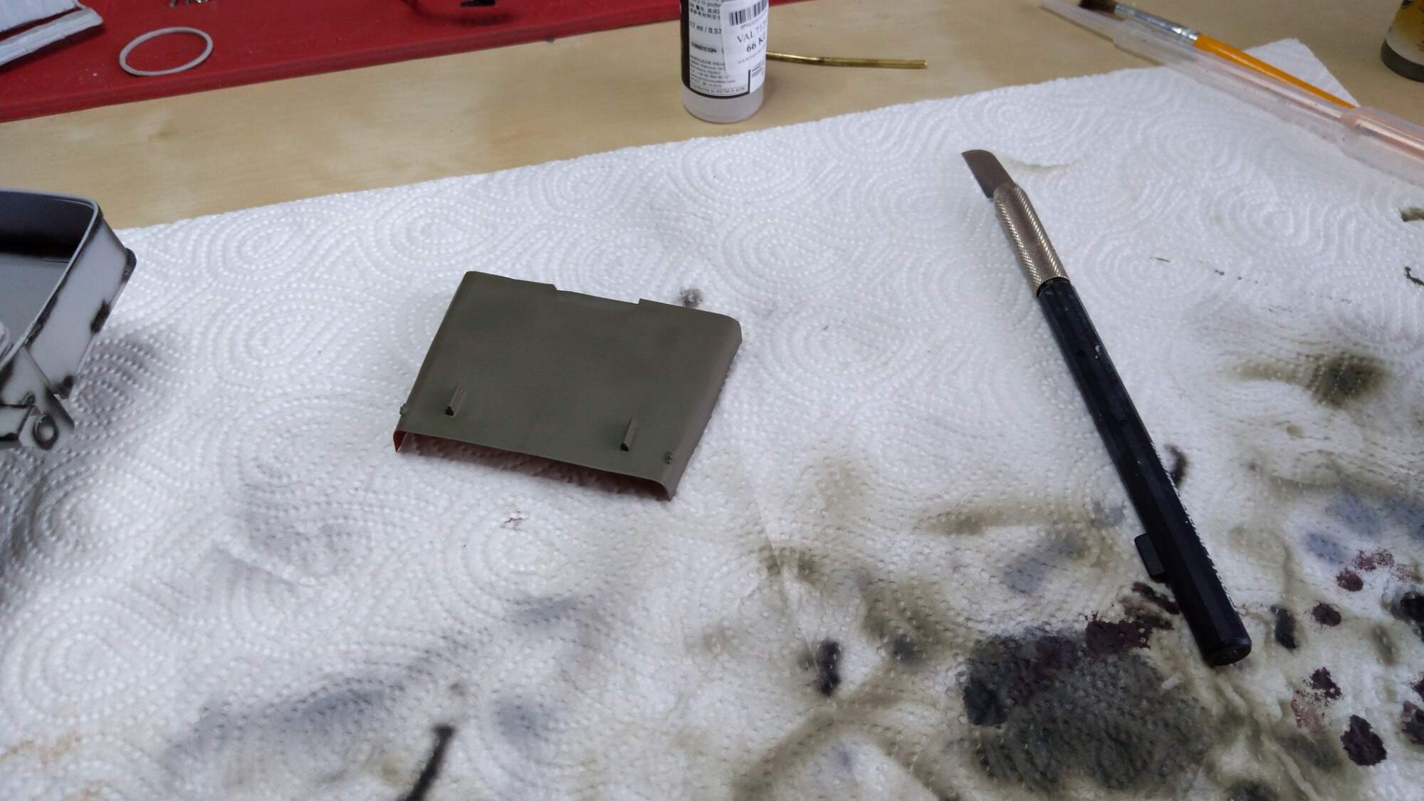 Nemám stříkací pistoli a kompresor, dobrou zkušenost jsem udělal se spreji od Tamyia. Jsou dražší, ale zatím se mi nic neloupe a drží i barva na barvě. Vím, že toto řešení je nouzovka, ale každý nemá hned celé vybavení.