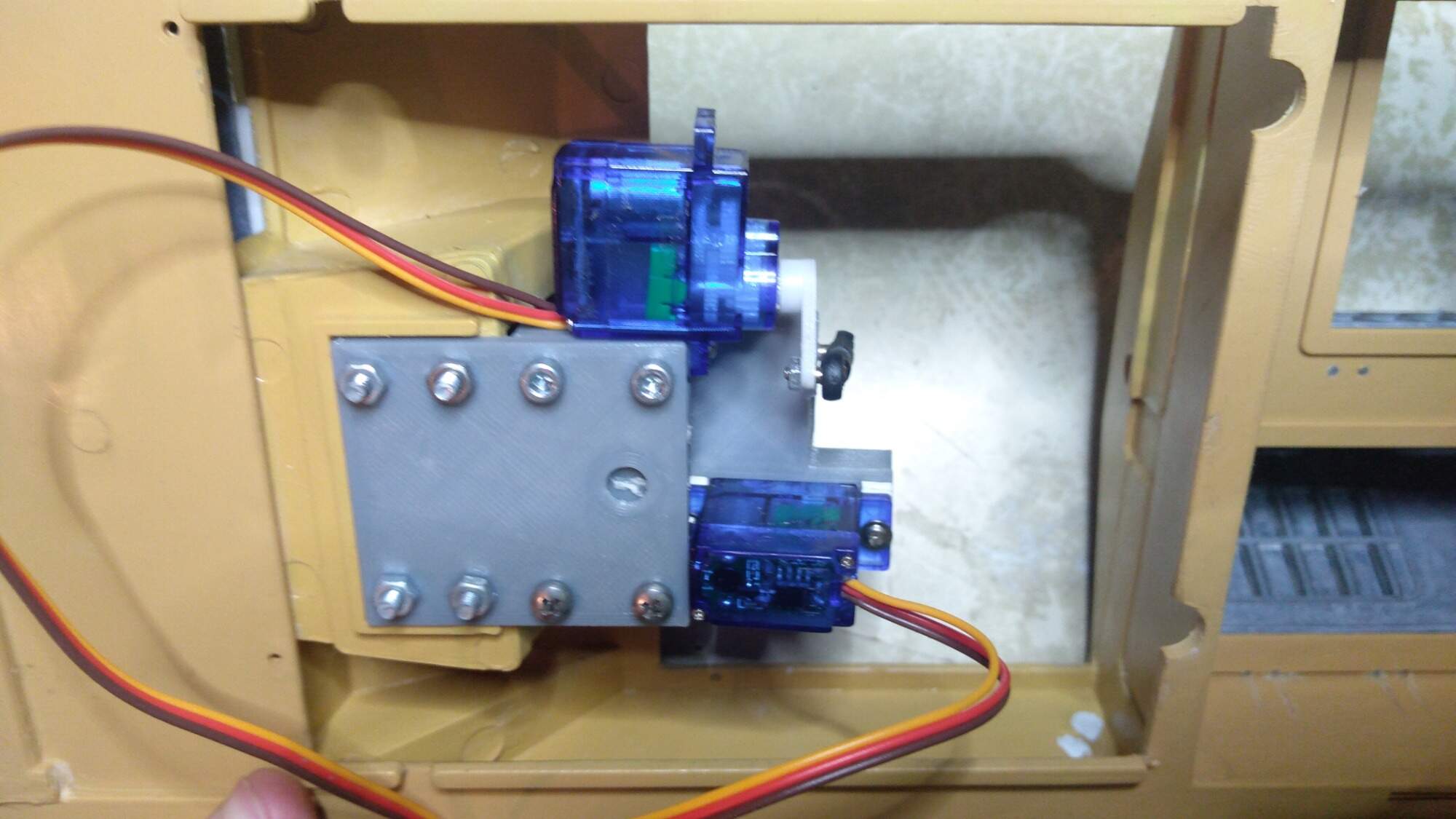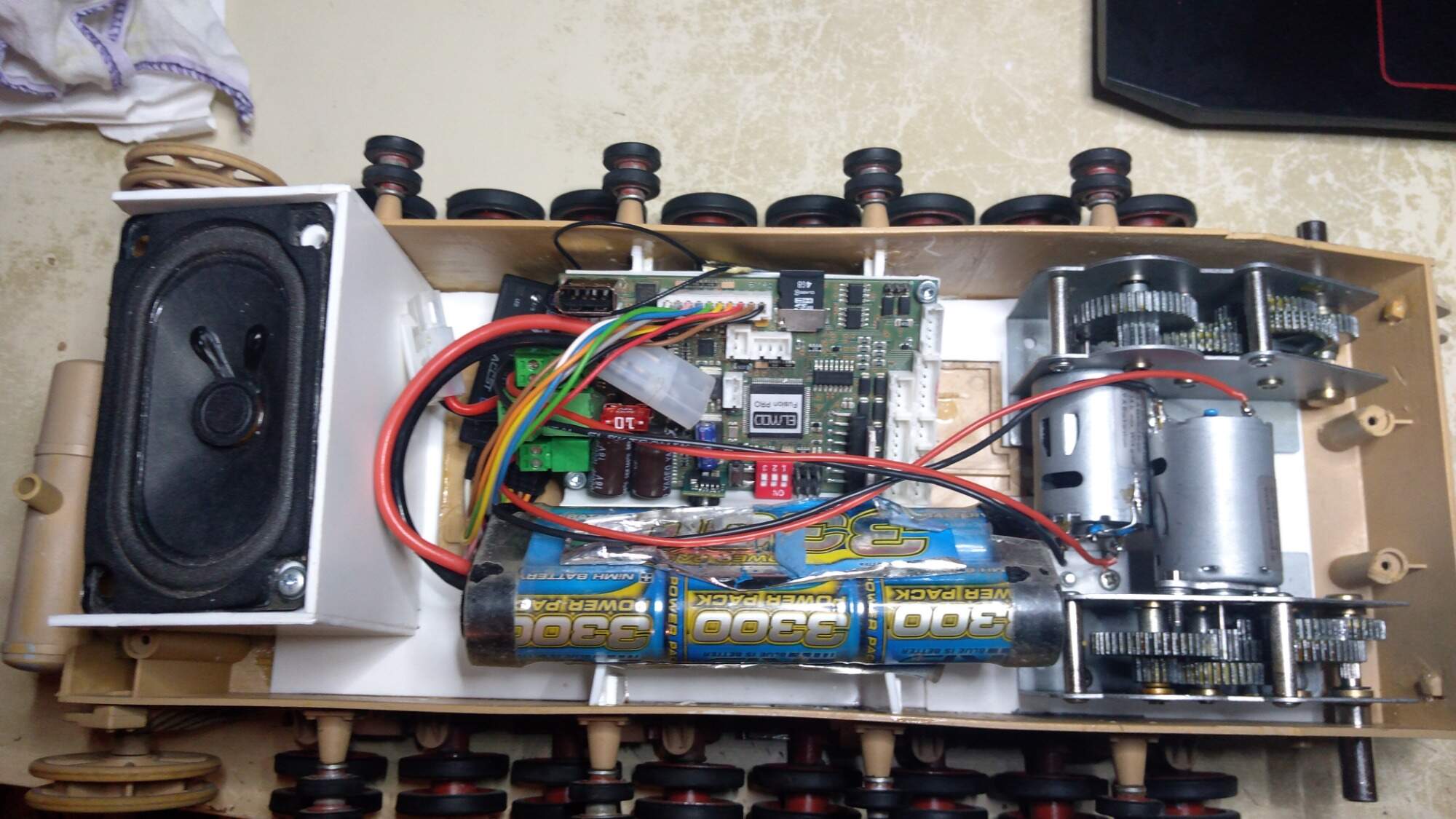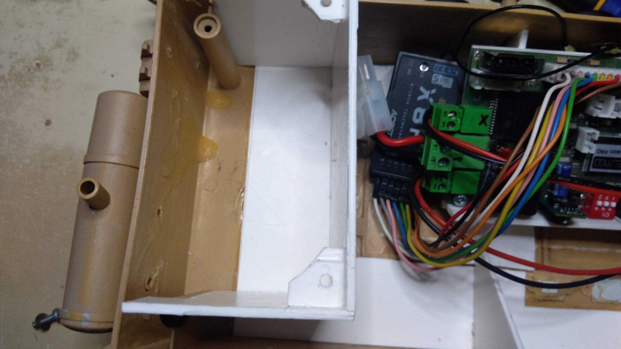 Část z toho o čem jsme se bavili jsem už udělal, vyplnil jsem díry ve vaně, víc jsem uspořádal elektroniku, přesunul jsem servo na zvedání děla a jelikož nefungovala tak jsem je i rozebral a zjistil jsem že nejdou jen proto, že byl vytržený jeden kabel :D , takže jsem rád že jsem nemusel kupovat nová.