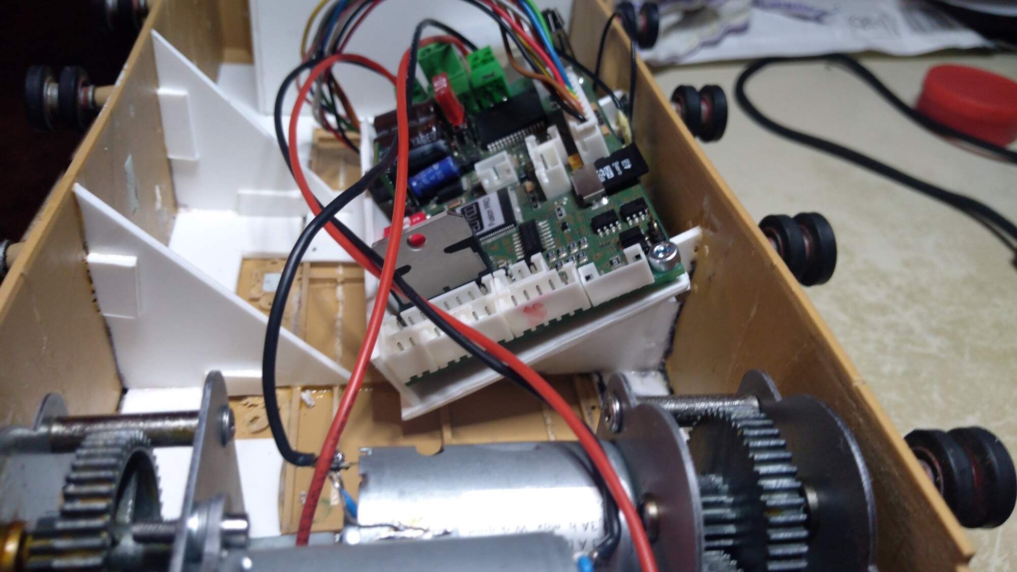 Elektroniku jsem uspořádal tak, aby její držáky fungovaly zároveň jako výztuhy, jen ještě nemám dokončený držák na reprák.