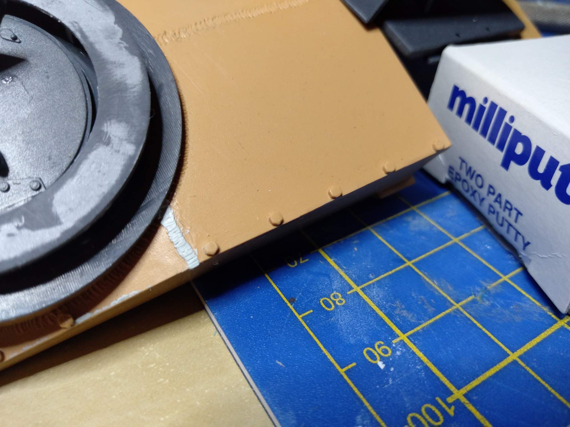 Začal jsem dělat sváry z miliputu který přinesl Ježíšek, zatím mi to moc nejde, nevím jak tenký mám ten váleček vyválet a jak tu plochu připravit, respektive vím že podle návodu u Panzera 3 od pana mrst bych to měl nanášet na surf, ale nemám ten rezavý a nechce se mi za něj dávat 400, ale mám tu jeden pískové barvy, mám to zkusit s ním?