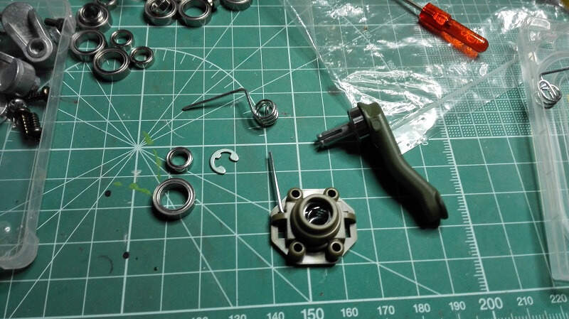 Tady u ramen začíná ona "operace" přes prdel.........složení ramen s ložisky (nahradil jsem jimi původní kluzná ložiska) bylo docela v pohodě, ale následující montáž společně s domečkem a pružinou byla ona rektální operace, páč se šroubovákem se ve vaně nešlo vytočit a malej šroubovák mi zase klouzal v hlavě šroubu.