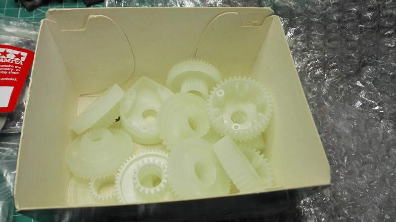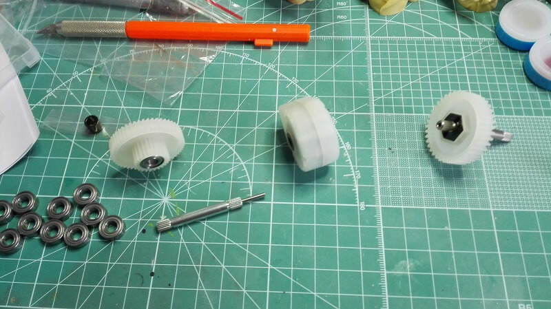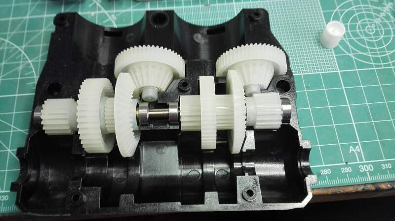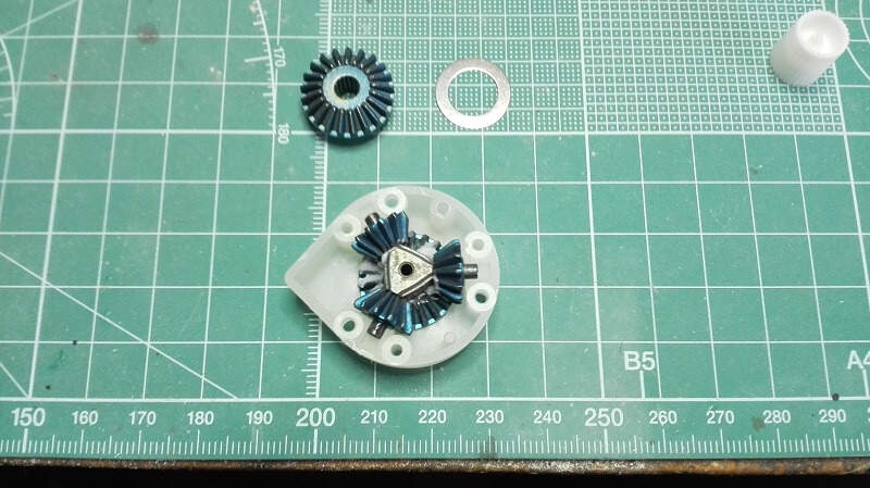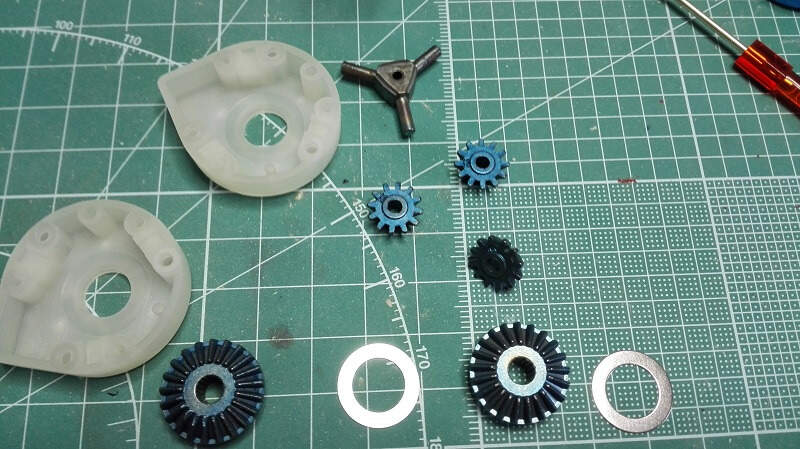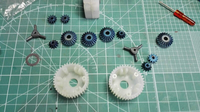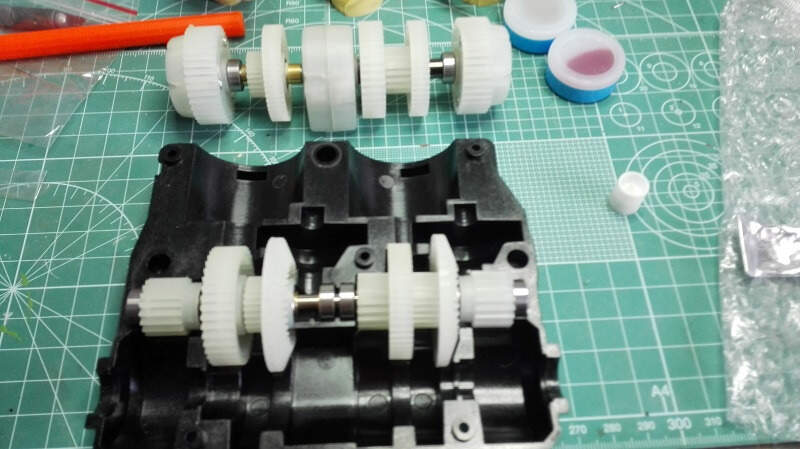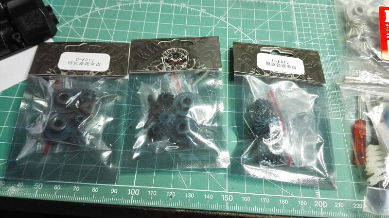Dneska zase pokročíme, první jsem se ve stavbě vrhl na kompletaci převodovek. Byly zcela jiné konstrukce než ty které mám v dosavadních tancích. Resp se jedná jen o jednu převodovku se dvěma motory (jeden pro jízdu vpřed/vzad a druhý pro zatáčení) a třemi diferenciály. Japonci mě trošku zmátli protože v sadě převodů bylo více kol než bylo potřeba, tak jsem pro jistotu poctivě počítal zoubek po zoubku. Do převodovky jsem na radu Ivana koupil od DKLMRC kvalitnější kuželová kola do diferenciálů a v práci jsem si vzal kvalitnější kuličková ložiska na uložení hlavních hřídelí.