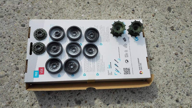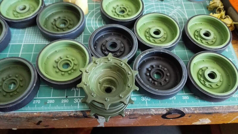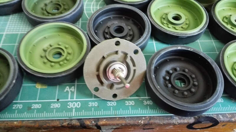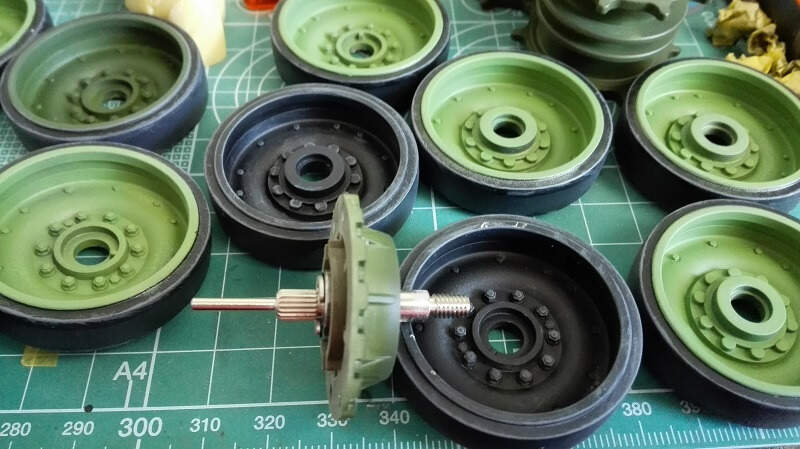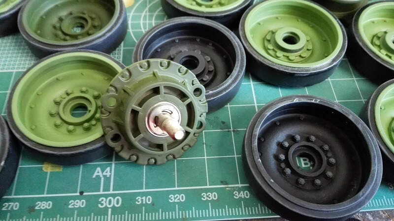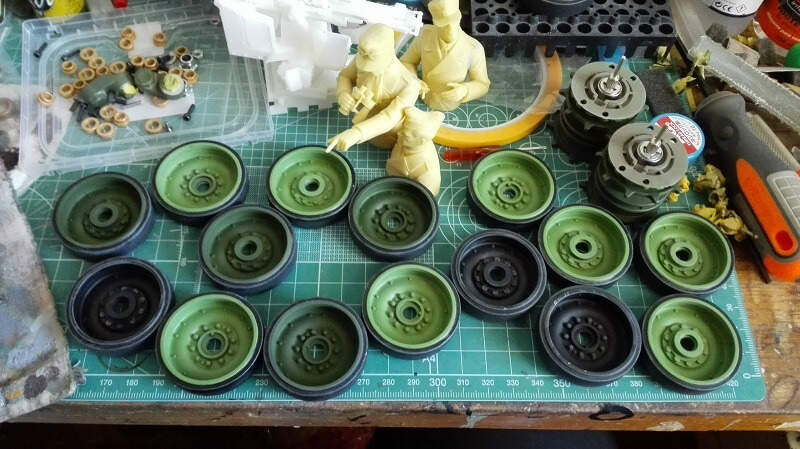 Tak dneska máme na pořadu dne pojezdová kola.......tady mě Tamiya trošku naštvala protože kolo s vnitřní částí "gumové" bandáže bylo v jednom kuse a dolepovala se vnější část bandáže, vznikla tam nehezká mouldline, tu jsem pracně obrušoval což u dvaceti kol (10 kol tvořených ze dvou částí) člověka docela naštve zvlýáčť když použije Tamiya řídké lepidlo a při lisování ložisek se mu ty zabroušený a zatmelený běhouny v místě spoje zase rozšklebí