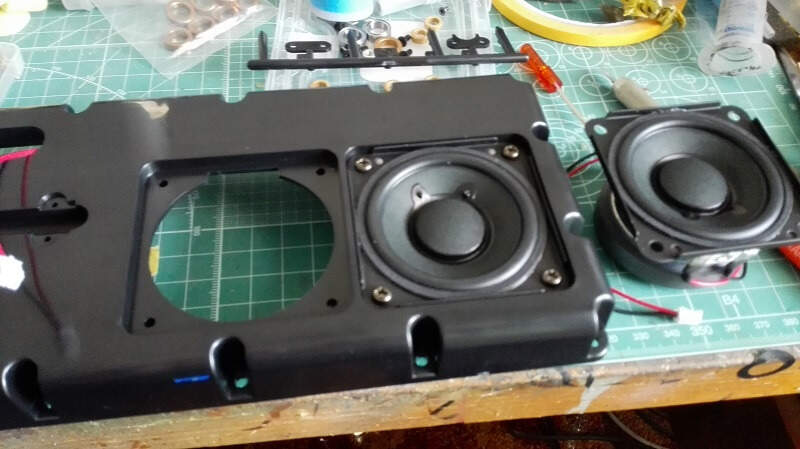 První jsem složil krabičku se dvěma reproduktorama v jejímž dně byla elektronika ovládající motory a světla.