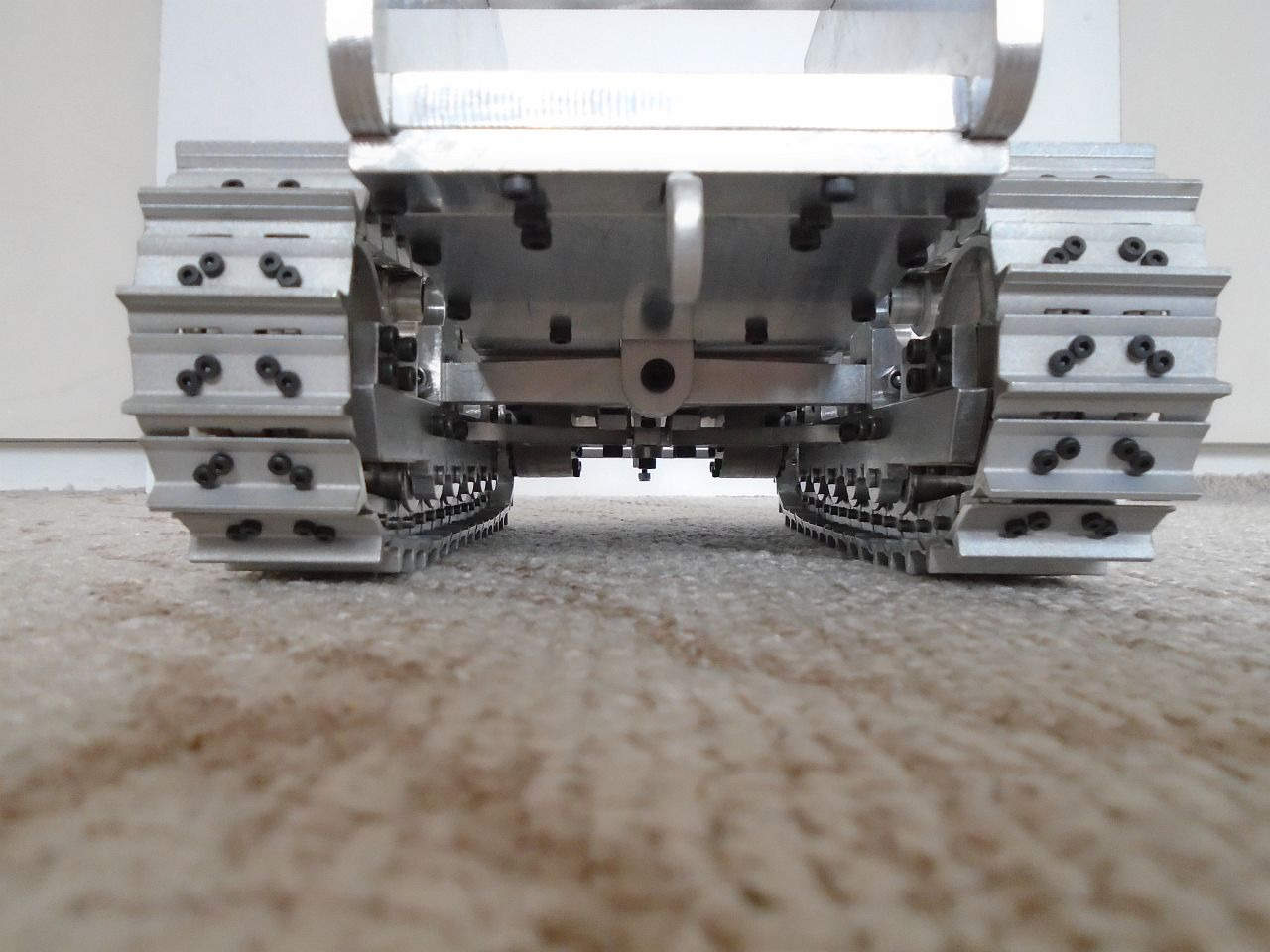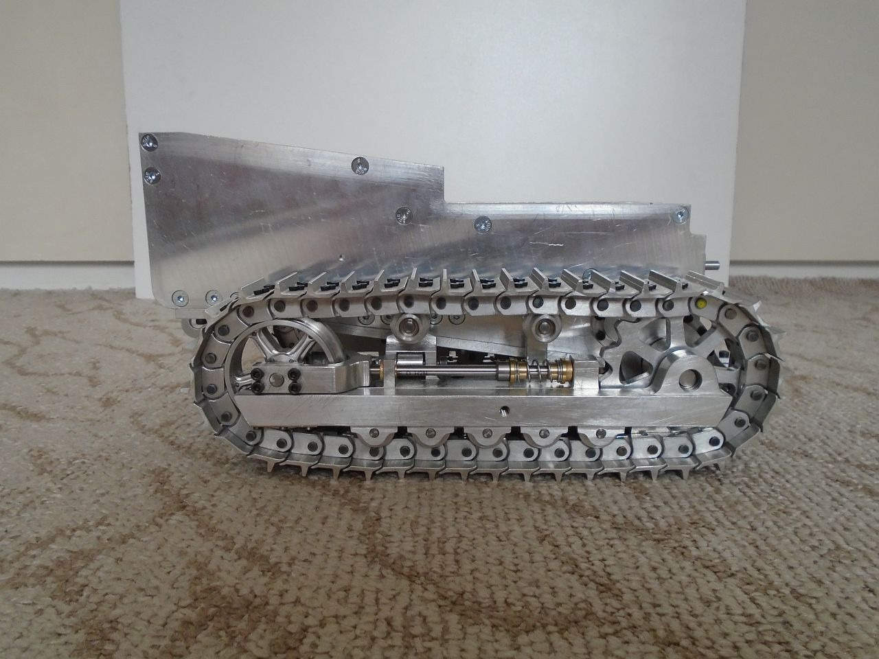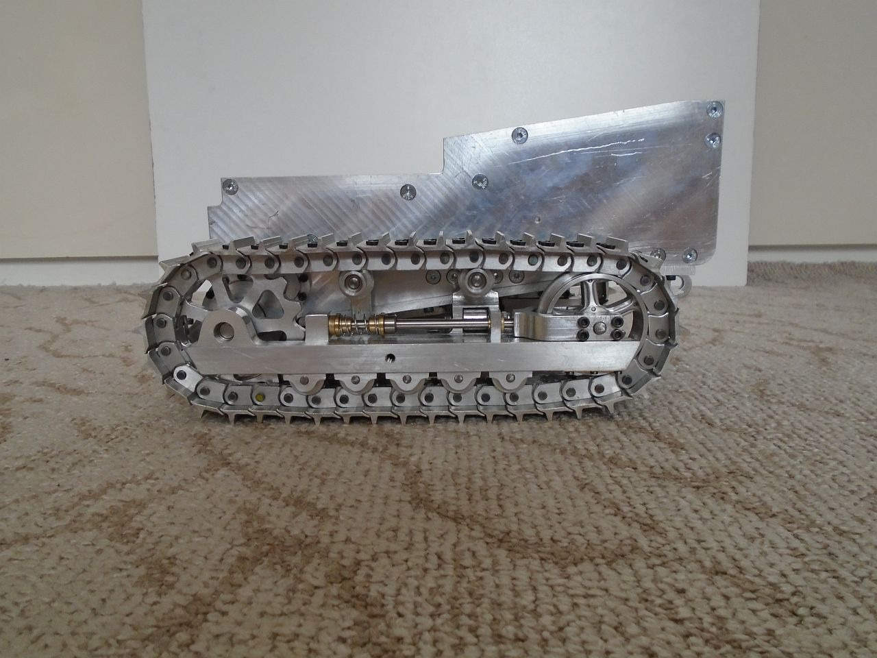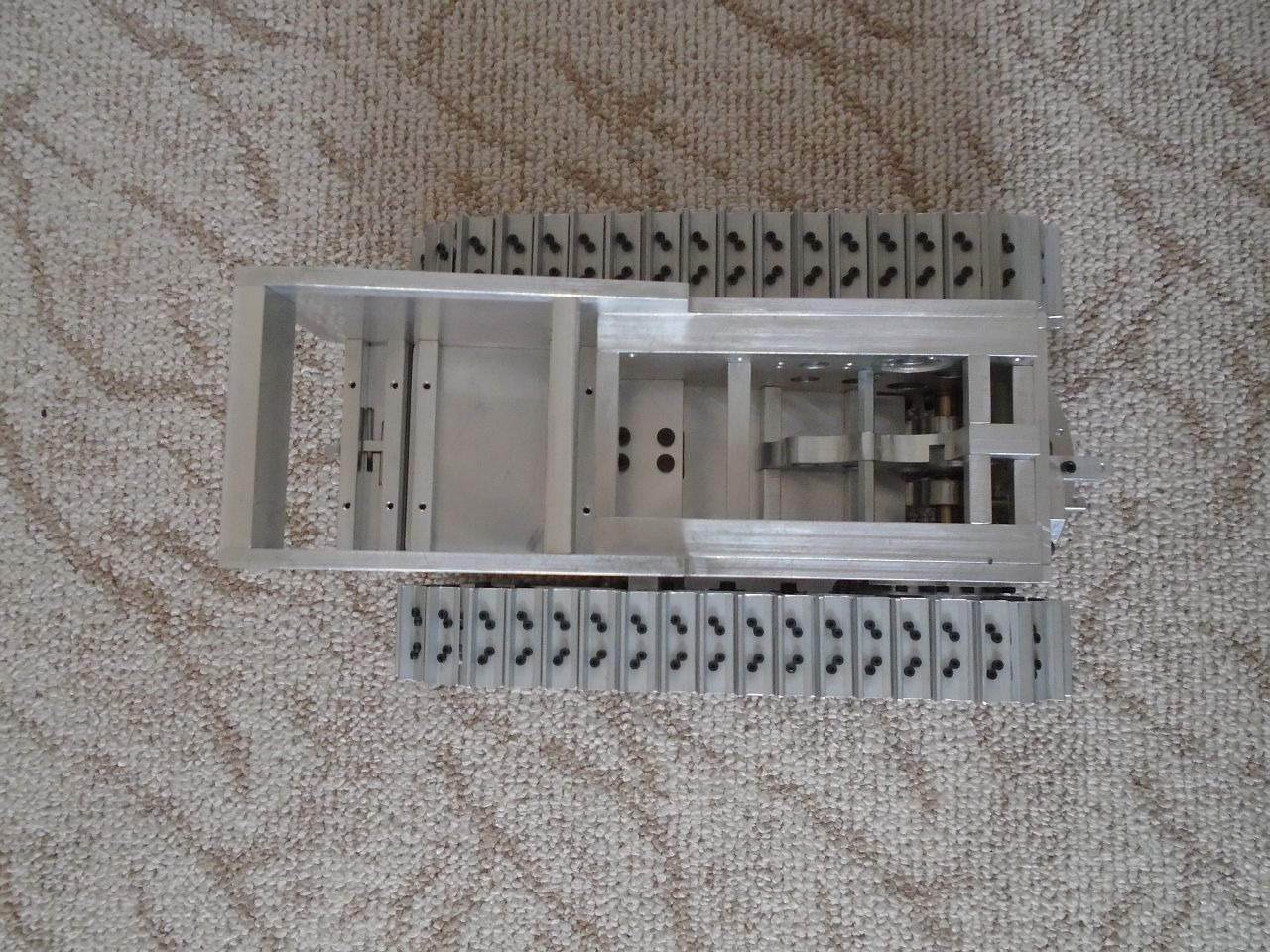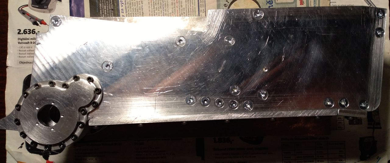 Základní konstrukce je tedy hotová. Teď mě čekají převodovky pohonu pásů a zdvihu radlice, poté radlice samotná a rám s mechanismem jejího zdvihu a potom kapota a elektroinstalace. Na několik hodně dalších měsíců mám tedy o "zábavu" postaráno