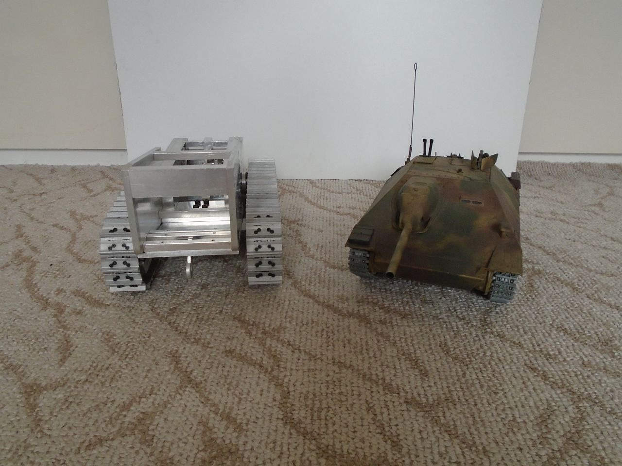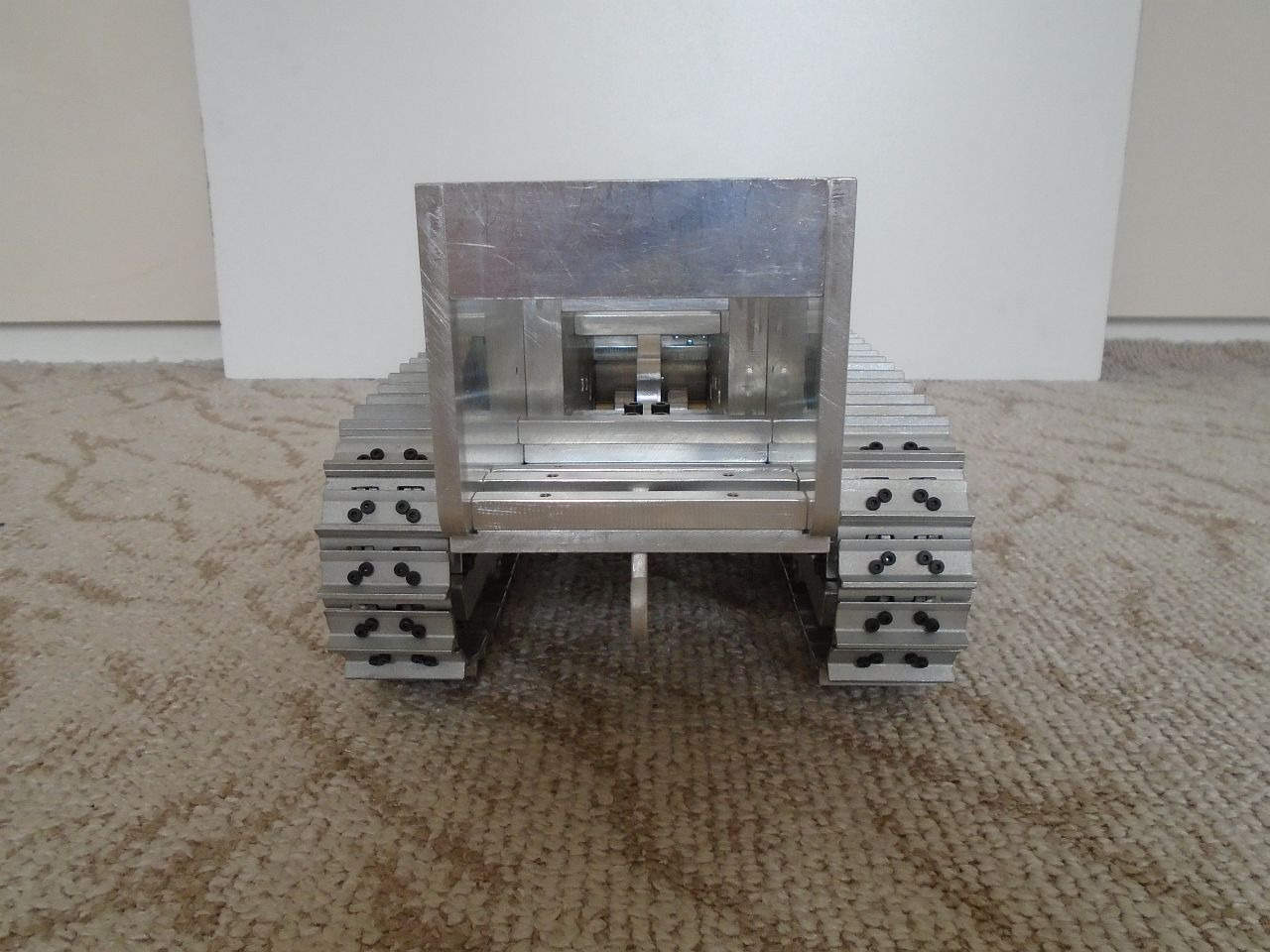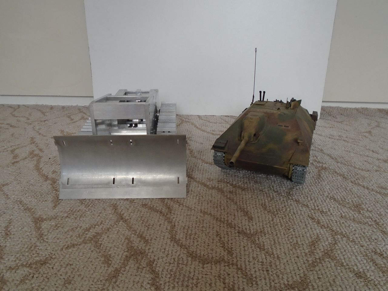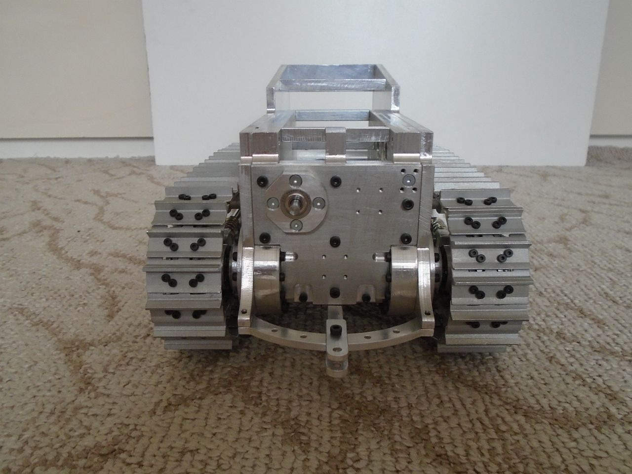Základní konstrukce je tedy hotová. Teď mě čekají převodovky pohonu pásů a zdvihu radlice, poté radlice samotná a rám s mechanismem jejího zdvihu a potom kapota a elektroinstalace. Na několik hodně dalších měsíců mám tedy o "zábavu" postaráno
